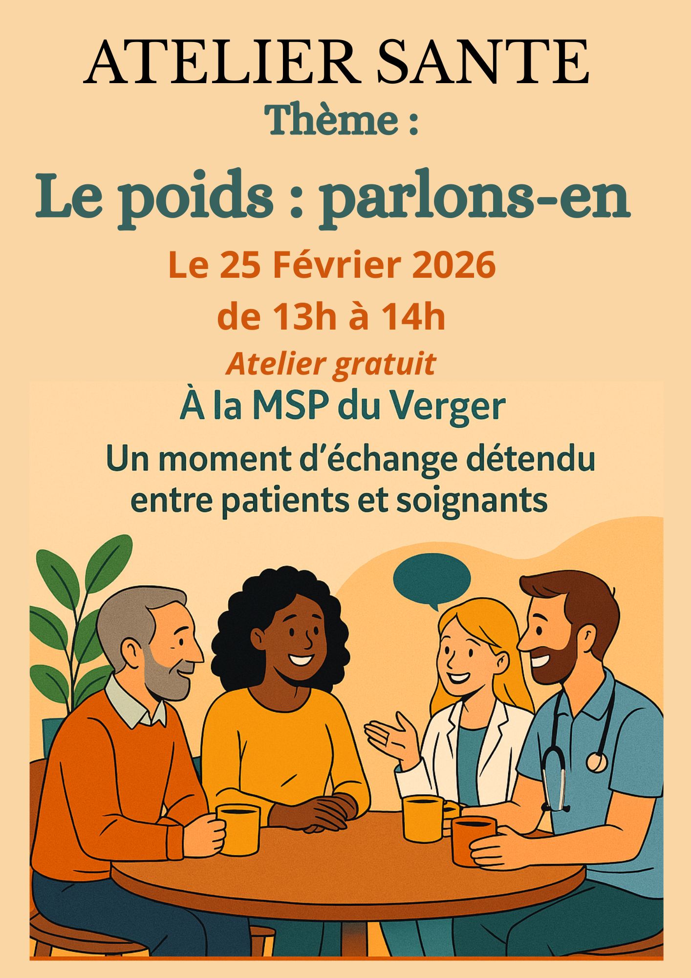 ATELIER SANTÉ – Un moment d’échange détendu entre patients et soignantsVendredi 9 mai 2025De 13h à 14hÀ la MSP du Verger